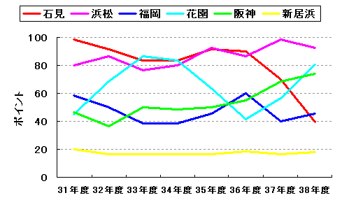 今シーズンも浜松だろう。安定感のある投手陣、バランスの良い攻撃陣と付け入る隙は見当たらない。しばらく浜松時代が続く予感。一時低迷した花園だが、すぐに体制を立て直してきた。もともと地力はあるチームだけに、打倒浜松の第一候補だろう。阪神は優勝争いをできるところまで、戦力をつけてきた。最悪の戦力からチームを引き継ぎ、ここまできたのはお見事。あとは、いつ1位の座を獲得できるかだ。福岡は3シーズン前の優勝から成績はやや下降気味。とはいえ、戦力的にはコマは揃っている。後半まで食らいついていけば、チャンスは十分ある。戦力が急降下なのが石見。昨シーズンは屈辱の5位だったが、今シーズンも厳しい戦いになるかもしてない。新居浜はなかなか浮上のきっかけをつかめない。ドラフトでの戦術的失敗続きが響いているように感じる。