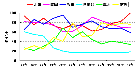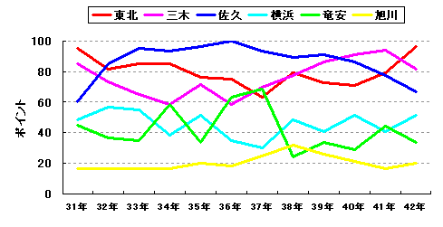 2強2中2弱。三木のV3に黄色信号。ここ数シーズンの着実な戦力補強により安定した戦いを続けている三木だが、今シーズンはそれ以上に戦力補強に成功している東北の前に屈する可能性が高いとみた。東北も三木同様、一時期戦力が低迷した時期があったが、完全に復活。特に今シーズンの戦力の充実ぶりには目を見張るものがある。一方、やや戦力の衰えがみられるのが佐久。Aクラス確保はできそうだが、どこまで優勝争いに絡むことができるか。横浜はやや不安定な戦いが続くものの、戦力を一新した今シーズンは台風の目になれる可能性を持つ。竜安、旭川は少しでも上位を狙いたいが、やや戦力が不足しているのが現実か。