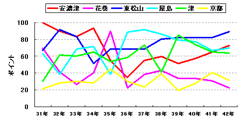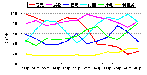 1強3中2弱。東松山が強い。ここ数シーズンリーグ優勝から遠ざかっているが、戦力的には最も充実していると言える。2シーズン、3シーズン振りのリーグ優勝を狙う安濃津、屋島も健在。それに昨シーズン念願のリーグ優勝を果たした津が絡む展開になるだろう。京都は結果は出ないものの、戦力補強は着実に成功していたが、今シーズンはまた一歩逆戻りした感がある。Aクラスは遠くなったか。チームの存在自体印象の薄くなった花巻はなんとかいままでの貯金で戦っている状態だが、戦力低下は明らか。