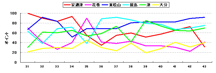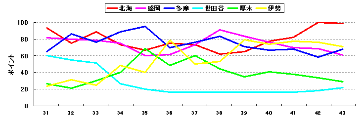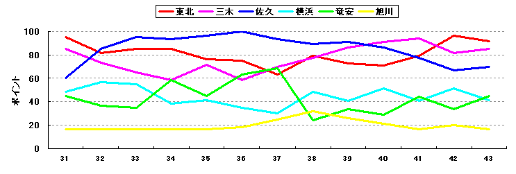 昨シーズンと傾向は同様。北海は理想とするチームに近づきつつある。基本は打力のチームであるが、投手陣も先発・中継ぎ・抑えのバランスは良い。各人が力を発揮できればV3も近いとみた。伊勢は投手陣は相変わらず安定しているが、打力の衰えが気になる。チーム力としては、一時期の強さはやや影を潜めた感がある。多摩と盛岡ももちろん戦力的は高いが、優勝を狙うためには、多摩は長打力に、盛岡は投手力にやや不安を残す。厚木はここ数シーズンは戦力が低下傾向。一方、世田谷が少しずつながら、戦力はアップしてきている。今後に期待したい。