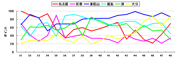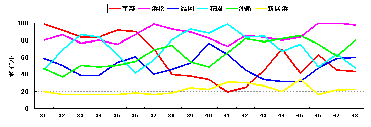 総合力ではやはり浜松か。当然V3を狙ってくるが、浜松としては2年連続で敗退しているベストプレーシリーズを視野に入れた戦いをしてくるだろう。その浜松に対抗してくるのは、やはり沖縄か。ここ一番の爆発力は浜松には負けないが、やや好不調の波が大きいのが気になるところ。中位球団は混戦模様。その中で、Aクラスに最も近いのはここ数シーズンでV字回復を果たした福岡だろう。昨シーズンはまさかの最下位だったが、戦力は確実にアップしている。花園は逆にここ数シーズンの戦力低下が気になる。ただ、もともと地力はあるチーム。また戦力は整えてくることだろう。宇部は新チーム発足後は戦力を低下させている。オーナー色になるまではまだ暫くかかりそうか。昨シーズン久しぶりのAクラス入りを果たした新居浜だが、戦力的にはまだ不足気味。だた、少しずつではあるが、戦力は回復傾向とはいえる。