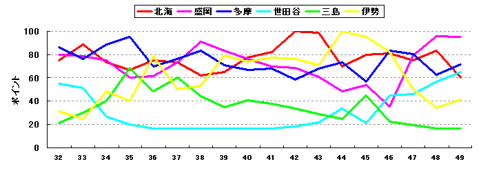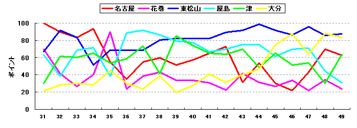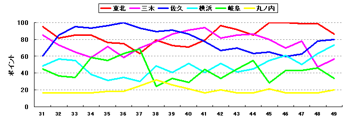 東北1強時代が影を潜め、Bリーグも戦国時代へ突入の予感。もちろん、東北が優勝候補の筆頭であるのは間違いないが、その東北に迫る戦力を整えてきたのが古豪チームの佐久と横浜。佐久は39年度シーズン以降はAクラスとBクラスの行ったりきたりの状況で、なかなか優勝争いに絡むことができていない。また横浜においてはしばらくBクラス生活が続いている。しかし、両チームとも着実に力は付けてきており、特にここ数シーズンの充実ぶりには眼を見張るものがある。開幕ダッシュこそ失敗したものの、台風の目となる可能性は大だ。三木は戦力低下には歯止めが掛かった。上位争いはもちろん、試合巧者ぶりを発揮すれば優勝争いに絡むことは十分可能であろう。昨シーズン2位と大躍進した岐阜だが、戦力的は上位との差はまだ若干あるように思える。丸の内の最下位脱出にはまだ時間が掛かりそうだ。