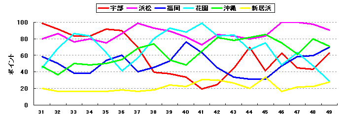 3連覇中の浜松の優位は揺るぎそうにないか。安定した戦いはさすがの一言で頭一つ抜け出している感がある。とはいえ、若干ながら戦力が低下傾向なのは気になるところ。その浜松を脅かすのは、沖縄、福岡、宇部の3チームになりそう。その中で、最も注目したいのはここ5シーズン程で急激な戦力アップをみせている福岡。この勢いで一気に頂点に上り詰める可能性は十分ある。沖縄はやや不安定な戦いぶりが改善されれば、優勝争いにからめる戦力は十二分にある。昨シーズンAクラス入りした宇部もAクラス入りはもちろん、混戦になれば優勝のチャンスもあるだろう。花園は戦力低下が大きく、2年連続の最下位もありそう。新居浜は徐々にではあるが、チーム事情は改善されつつある。継続的な戦力補強をおこなえば、さらに安定した戦いが出来るだろう。