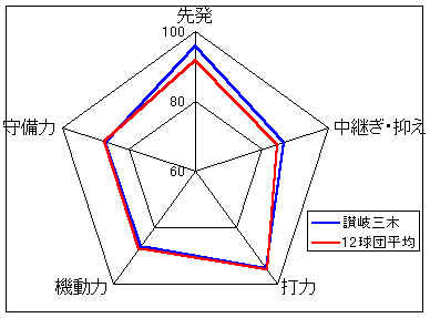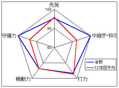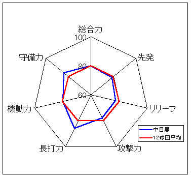戦力分析:投手力・守備力は平均的だが、強力打線で打ち勝つのが持ち味。また、機動力も12球団ではぬきんでており、スタメンのうち5人が足A。足を使った攻めが決まれば、得点力は倍増する。野手の中心は足もあり、4年度は3冠王を獲得した大築。