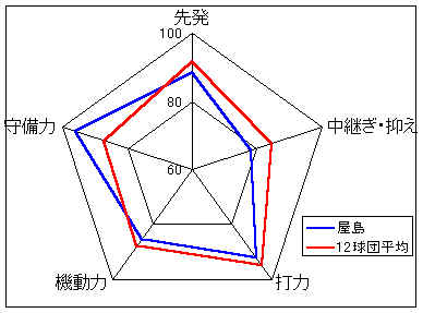 先発は比較的充実しているが、守備力・機動力がやや劣り、苦しい戦いになるだろう。しかし、守備力をアップすれば投手力はいいだけに、十分上位は狙えるだろう。