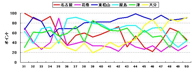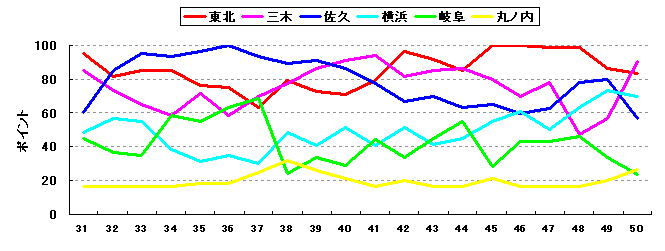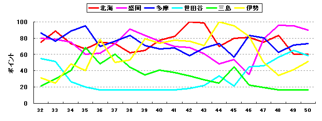 昨シーズンに続き東北の戦力低下が続く。それに対して、大幅な戦力アップをみせたのが三木。47年度シーズンにはリーグ優勝を果たしているが、ここ10シーズンほどは東北の後塵を拝してきたがここにきて古豪復活となりそう。とはいえ、もちろん東北の力はまだまだ健在。2強体制には変わりないが、最終的には三木が抜け出しそうだ。今シーズンも台風の目となりそうなのは横浜。毎シーズン着実に戦力を付けてきており、非常に不気味な存在になりつつある。佐久はBクラスがちらつく。戦力的にはまだ上位との差はそう大きくないが、昨シーズンからの大幅な戦力低下が気になる。新チーム体制になり戦力を上げてきている丸の内は念願の最下位脱出を果たしそう。一方、ここ数シーズンでの戦力低下が続く岐阜は最下位転落の危機。ただ、戦力的には両チームの力はほぼ同等。最後まで目が離せない。