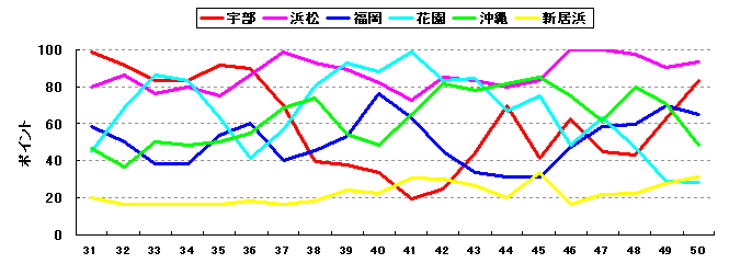 浜松がやはり強い。昨シーズンは福岡にリーグ優勝を譲ったが、今シーズンの本命であるのは間違いない。ただ、スタートダッシュに失敗したのはやや気になるところ。その浜松の対抗馬となるのは、ここ数シーズンで急激にチーム力をアップさせている宇部。チームの補強ポイントも的を射ており、オーナーの手腕の高さを感じる。浜松・宇部の2強時代が始まる予感。昨シーズンリーグ優勝の福岡はAクラスは確保できそうだが、連覇は難しいか。沖縄は戦力の低下がやや気になる。Aクラス確保が現実的な目標となりそう。新居浜は着々と力を付けてきている。このまま上位定着できるところまで、戦力アップを目指して欲しい。花園は目ぼしい補強も少なく、しばらく低迷期が続きそう。