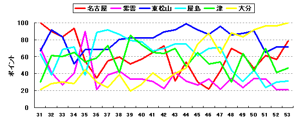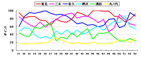 東北と佐久との一騎打ちになりそうだ。昨シーズン、13年ぶりのリーグ優勝を果たした佐久の勢いは残るものの、今シーズンは強豪東北の充実ぶりが目を見張る。一時期戦力の衰えがみられたものの、ここ数シーズンで戦力を整えてきたのはさすがといったところ。昨シーズン、17年ぶりのBクラスに沈んだ三木だが、今シーズンも若干戦力的は低下している。まずは、Aクラスの確保が最低限の目標となるか。51年度シーズンに再編後初のリーグ優勝に輝いた横浜だが、その後の戦力低下がやや気になるところ。丸ノ内と新球団酒田は最下位争いになってしまうか。戦力的にはここ数シーズンこの2球団でデットヒートを繰り広げているが、さらに上位を目指したいところ。