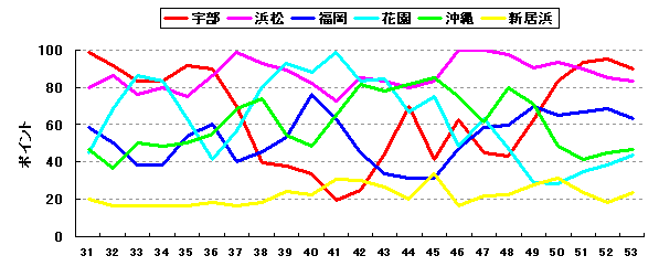 傾向は昨シーズンと大きく変わらない。やはり、宇部と浜松の2強に福岡が絡む展開になりそうだ。宇部は昨シーズン、戦力的は優勝候補であったがなかなか波に乗れずリーグ優勝を逃しており、今シーズンにかける意気込みは並々ならぬものがあろう。スタートダッシュに成功すればそのまま突っ走る可能性もある。浜松は若干ながら戦力低下が続いていることろが気になるが、もちろん優勝候補の1チームであることには変わりはない。昨シーズン、その2強を抑えてリーグ優勝に輝いた福岡だが、今シーズンも戦力的には3番手からの頂点を目指す。しばらく、やや精彩を欠いている沖縄と花園だが、確実に戦力は整えてきている。Aクラスを果敢に狙って欲しい。新居浜は今シーズンも厳しい戦いを強いられそう。