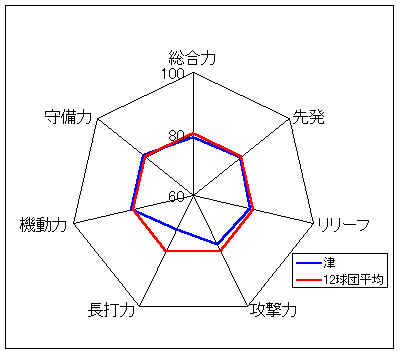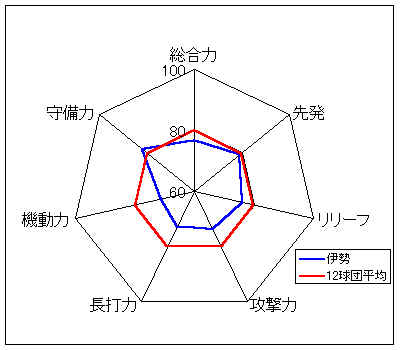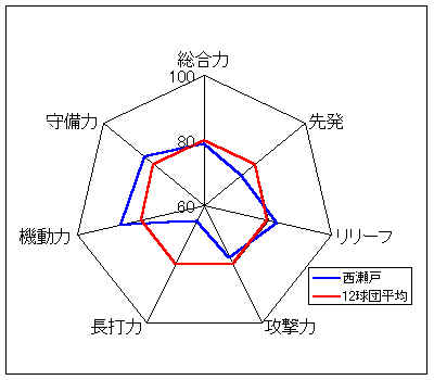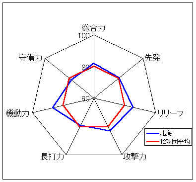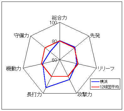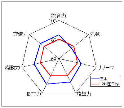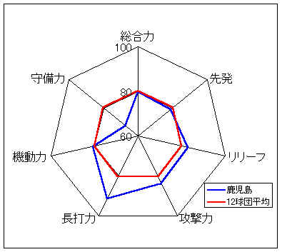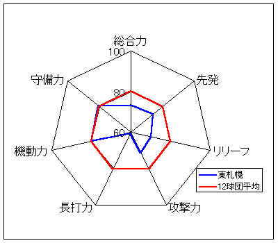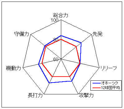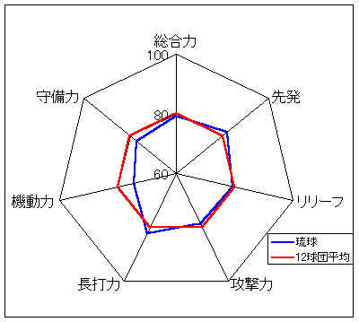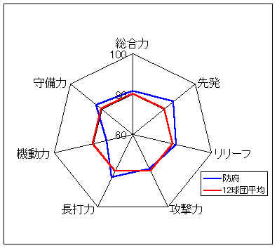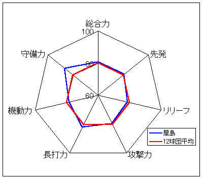 コメント:弱点は先発と打力。それを強力リリーフ陣と機動力でカバーできるかがポイントになりそう。守備力は悪くない。